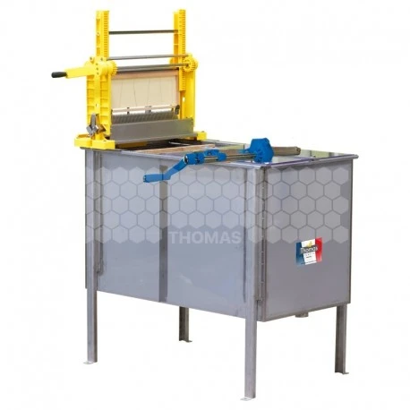 - d’un extracteur manuel Tetra Mini Thomas pour 9 1/2 cadres Dadant ou Voirnot hausse 13,5 cm avec bac centralisateur inox Thomas.